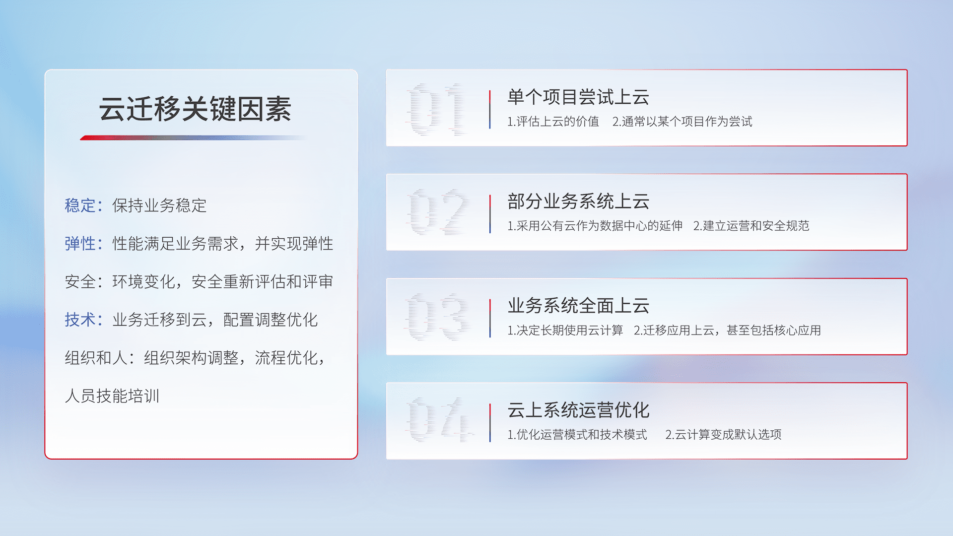 结合实际业务,,,,从规划设计、、云平台选型、、、云原生改造、、、、数据迁移、、集成交付,,,迁移全过程为客户识别最佳上云路径,,做好风险识别管理,,,,设计网络架构、、、、身份权限、、、、安全审计合规、、、操作审计、、、、日志审计、、监控告警策略、、多站点容灾设计等,,对云上基础设施进行整体规划,,,提升IT治理水平,,以满足弹性、、、、高可用、、高性能的需求。。。。