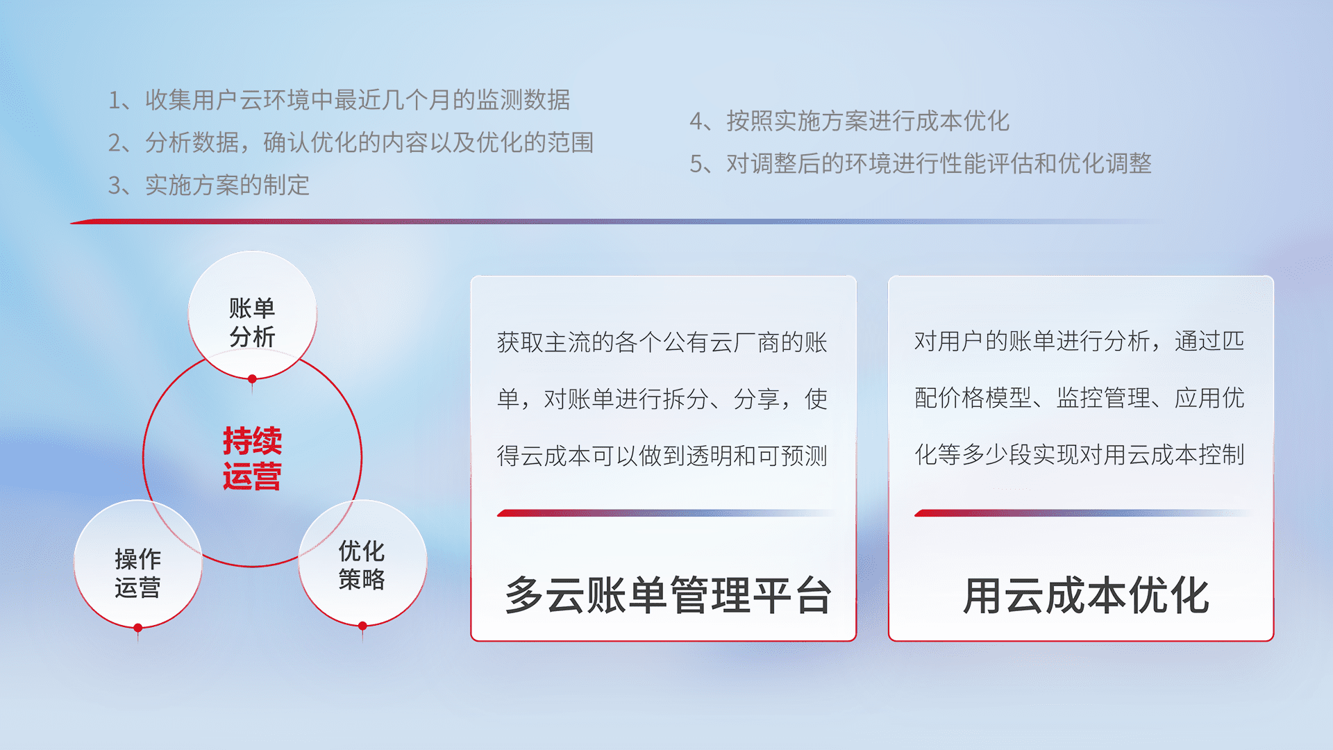 通过多云纳管,,以统一的资源数据模型把客户的云资源进行抽象和封装,,,进而实现对多云资源的统一操作,,,保障云资源管理的可靠性、、、稳定性与可用性。。量身定制化运维内容,,配置、、、、开发运维、、补丁管理、、、、备份、、、监控、、认证和访问管理、、、审计和日常巡检等,,保障在用云过程中的可靠度,,,稳定度以及高可用率。。。。
